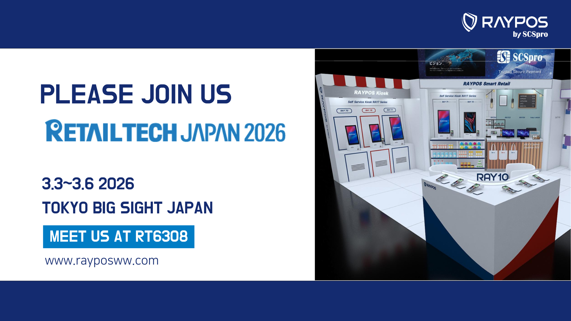 RETAIL TECH JAPAN 2026ブースにてお会いしましょう。#RT6308。RAYPOS製品とソリューションがビジネスの効率とセキュリティをどのように向上させるかをご紹介します